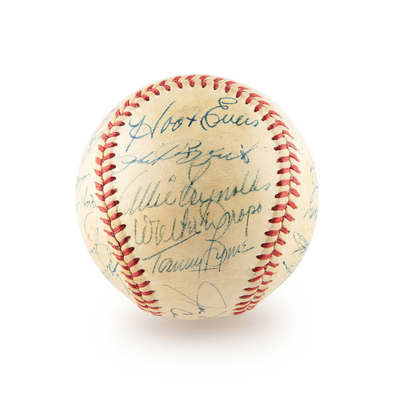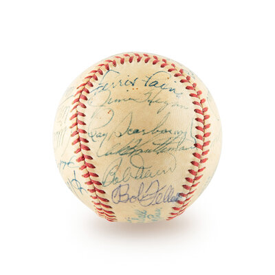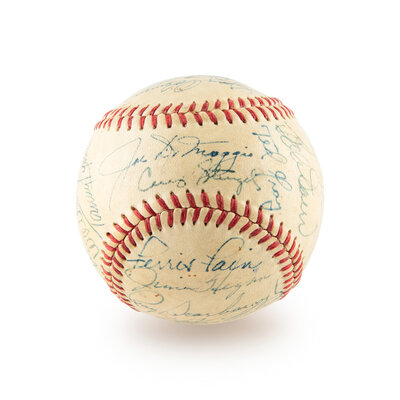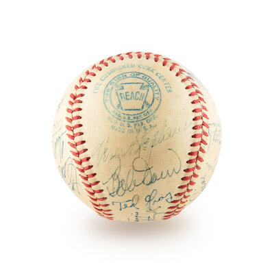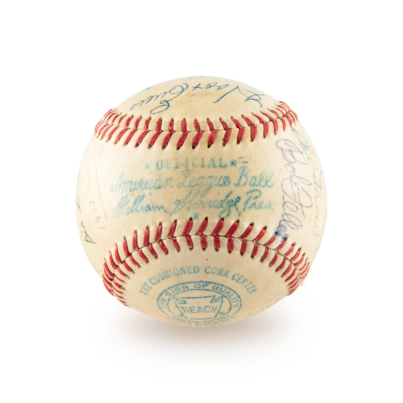 Comprising signatures of Ted Williams, Jerry Coleman, Hoot Evers, Art Houtteman (x2), Bob Lemon, Ted Gray, Bob Feller, Tom Henrich, Bobby Doerr (x2), Ferris Fain, Jim Hegan, Ray Scarborough, Phil Rizzuto, Allie Reynolds, Walt Dropo, Tommy Bytne and Vern Stephens. The signatures of Joe DiMaggio and Casey Stengel have been deemed clubhouse versions.