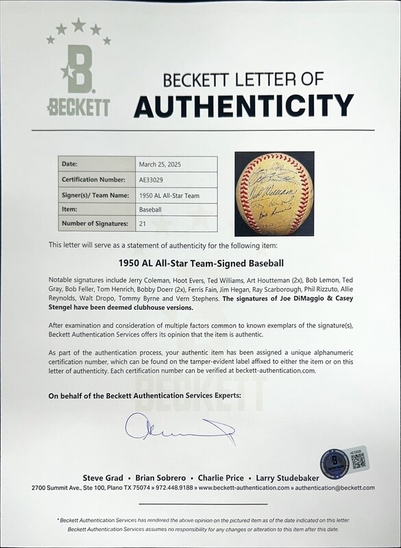 A 1950 American League All Stars Signed Autograph Baseball Including Ted Williams (Beckett Authentication Services)
