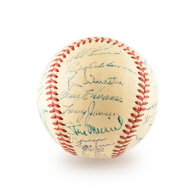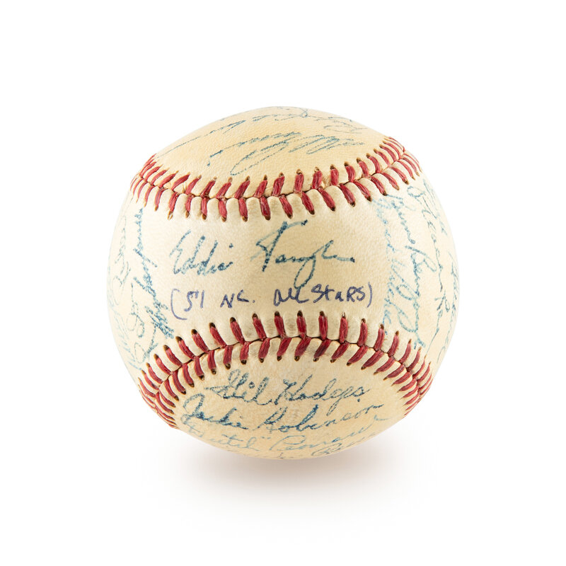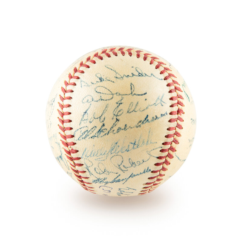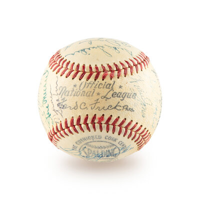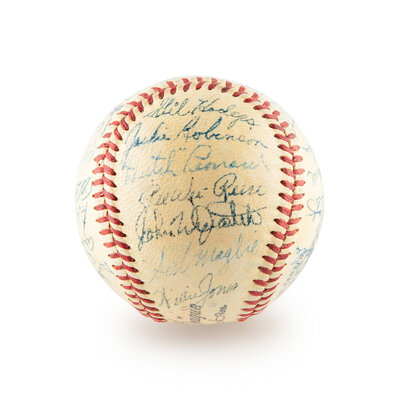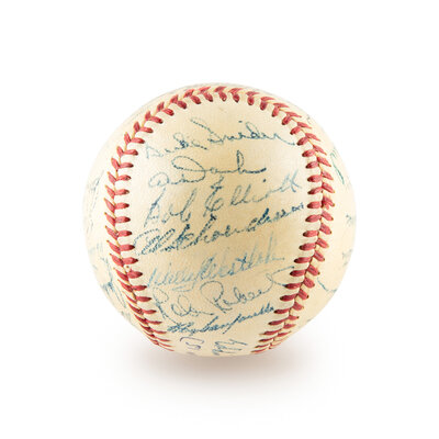 Comprising signatures of Jackie Robinson, Roy Campanella, Dutch Leonard, Pee Wee Reese, Johnny Wyrostek, Sal Maglie, Willie Jones, Warren Spahn, Stan Musial, Larry Jansen, Bruce Edwards, Del Ennis, Richie Ashburn, Ken Silvestri, Eddie Sawyer, Gil Hodges, Duke Snider, Al Dark, Bob Elliott, Red Schoendienst, Wally Westlake, Robin Roberts, Benny Bengough, Preacher Roe, Ewell Blackwell, Enos Slaughter and Dust Cooke.