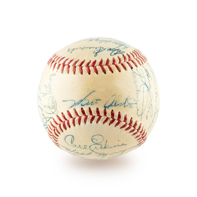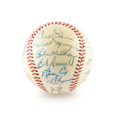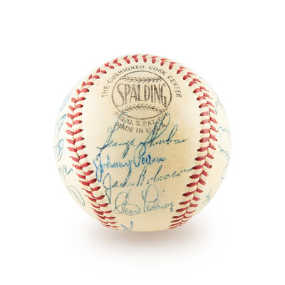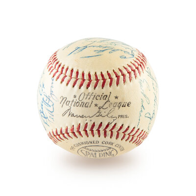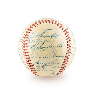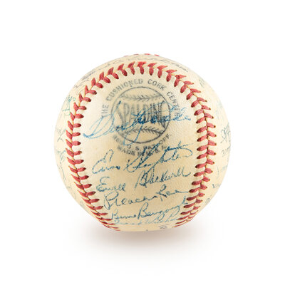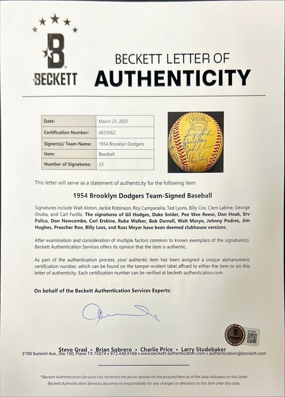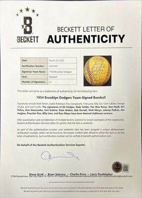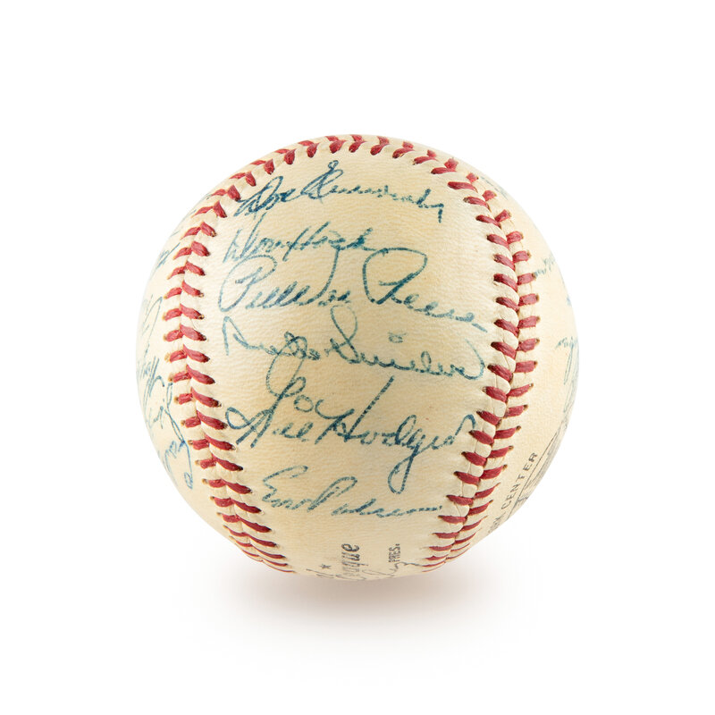 Comprising signatures of Jackie Robinson, Walt Alson, Roy Campanella, Ted Lyons, Billy Cox, Clem Levine, George Shuba and Carl Furillo. The signatures of Gil Hodges, Duke Snider, Pee Wee Reese, Don Hook, Erv Palica, Don Newcombe, Carl Erskine, Rube Walker, Bob Darnell, Walt Moryn, Johnny Podres, Jim Hughes, Preacher Roe, Billy Loes and Russ Meyer have been deemed clubhouse versions.