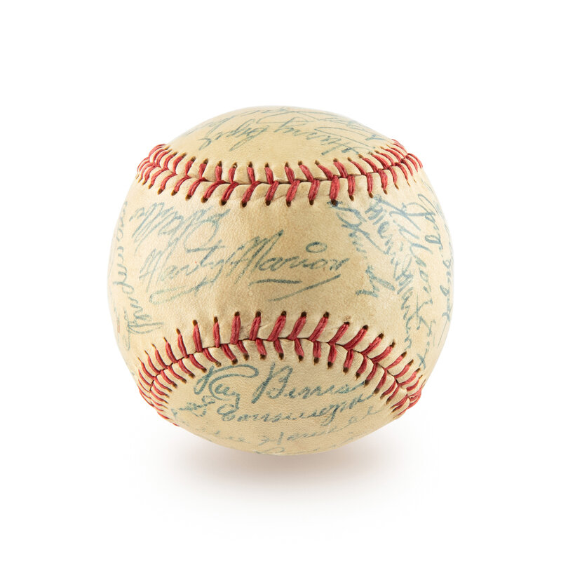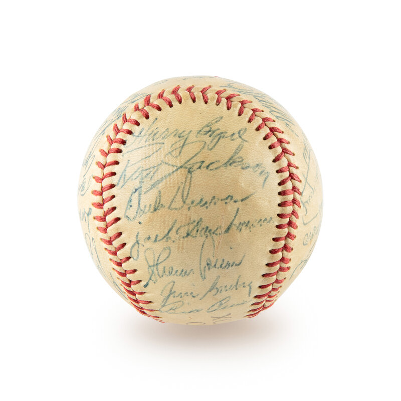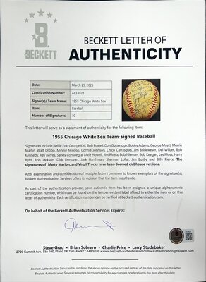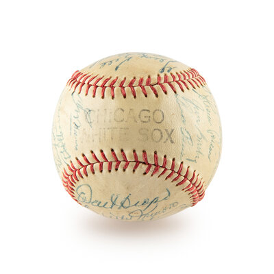 Comprising signatures of Nellie Fox, George Kell, Bob Powell, Don Gutteridge, Bobby Adams, George Myatt, Morrie Martin, Walt Dropo, Minnie Minoso, Connie Johnson, Chico Carrasquel, Jim Brideweser, Del Wilber, Bob Kennedy, Ray Berres, Sandy Consuegra, Dixie Howell, Jim Rivera, Bob Nieman, Bob Keegan, Les Moss, Harry Byrd, Ron Jackson, Dick Donovan, Jack Harshman, Sherman Lollar, Jim Busby and Billy Pierce. The signatures of Marty Marion and Virgil Trucks have been deemed clubhouse versions.