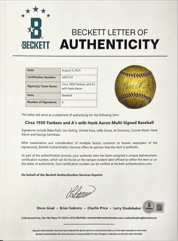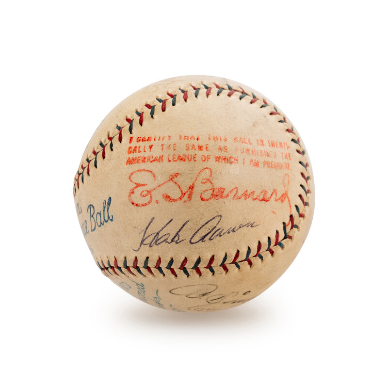 Crowning the collection is the autograph of Hank Aaron, the man who ultimately eclipsed Ruth’s career home run record, bridging two eras of baseball greatness.