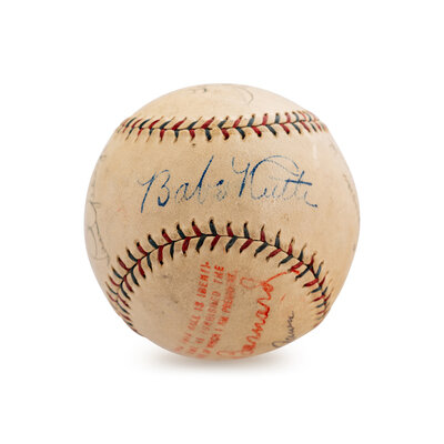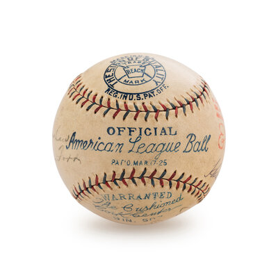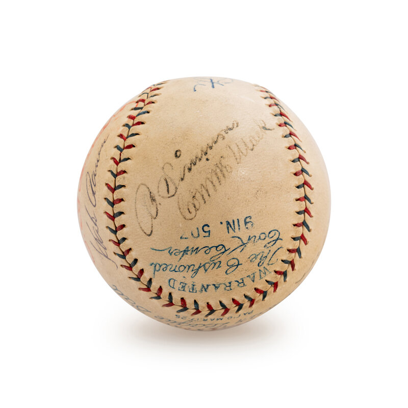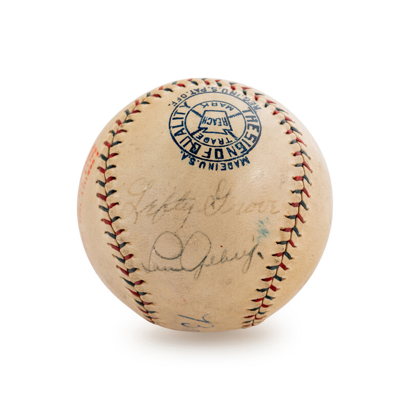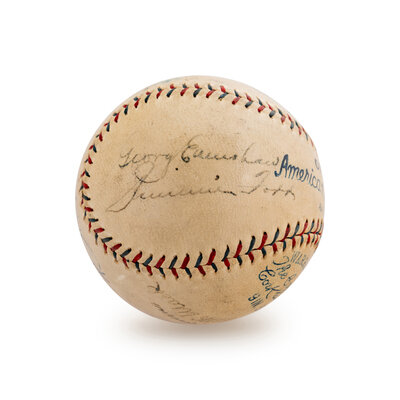 Surrounding the "Sultan of Swat" are the signatures of Lou Gehrig, Jimmie Foxx, and Al Simmons — for a total of four of the five Hall of Famers famously struck out in succession by Carl Hubbell during the 1934 All-Star Game. Their signatures, rich in history, bring added significance to this iconic artifact. Connie Mack, Lefty Grove and George Earnshaw are additional historic names from this era who have added their signature.