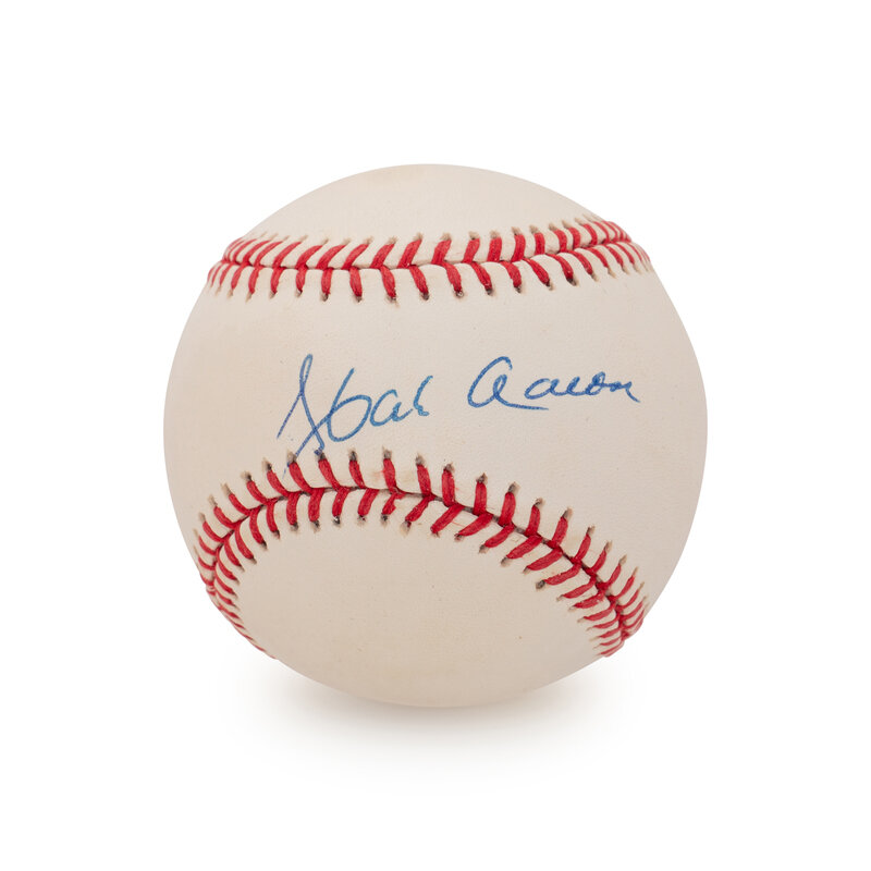 Inscribed "Hank Aaron" in blue ink on sweet spot.