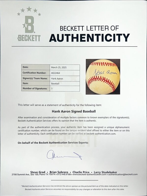 A Hank Aaron Single Signed Autograph Baseball (Beckett Authentication Services)