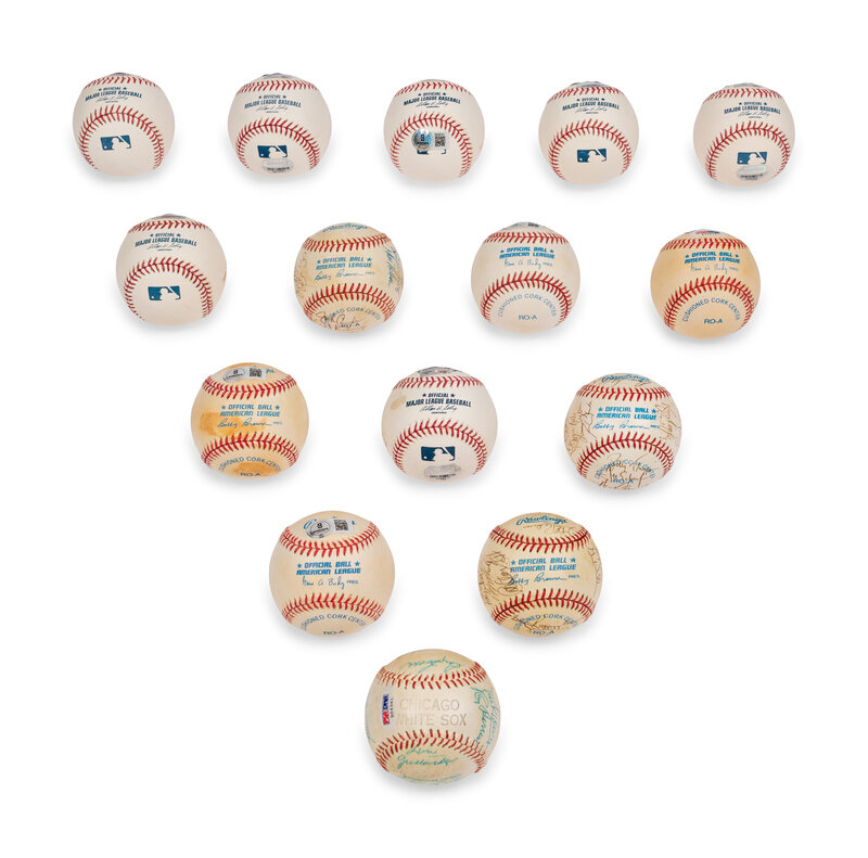 Comprising Luis Aparicio signed baseball; Early Wynn signed baseball; two Frank Thomas signed baseballs; Ron Kittle signed baseball; Jerry Harriston signed baseball; Mark Buehrle signed baseball; 1989 White Sox team signed baseball; Al Lopez signed baseball; LaMarr Hoyt signed baseball inscribed Cy Young 83 (x2); Jim Thome signed baseball; 1987 White Sox Team Signed Baseball; 1986 White Sox Team Signed Baseball; 1950s White Sox Signed Baseball including Nellie Fox, Early Wynn, and more.