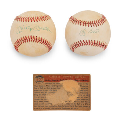 Featuring single signed baseballs autographed "Mickey Mantle" and "Yogi Berra" with 1957 Topps Yankees Power Hitters baseball card No. 407. Card has paper loss on reverse.