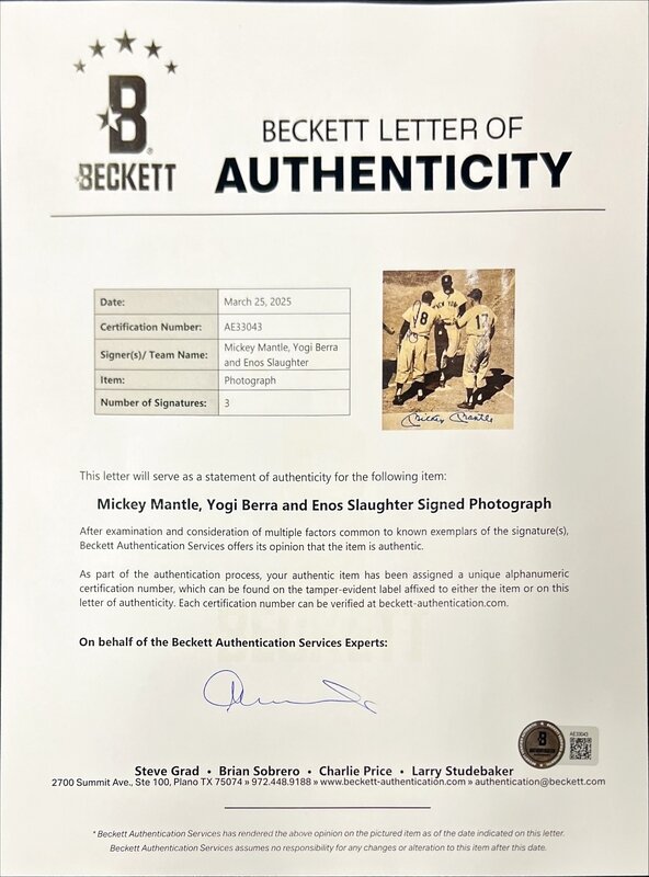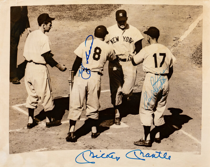 Signed "Mickey Mantle", "Yogi Berra" and "Enos Slaugther" all in blue Sharpie.