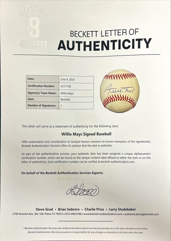 A Willie Mays Single Signed Autograph Baseball (Beckett Authentication Services)