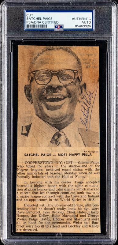 Singed "Satchel Paige" in blue ink on newspaper clipping from Paige's induction into the Baseball Hall of Fame.