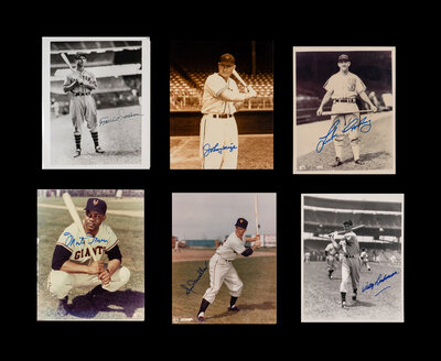 Comprising Don Newcombe (x2),; Carl Erskine (x2), Gil Hodges (x2); Pee Wee Reese and Duke Snider dual signed; Don Drysdale (x3), Duke Snider; Pee Wee Reese, Carl Erskine, Duke Snider and Carl Furillo, Pee Wee Reese (x2), Joe Black, Andy Pafko, Walter Alston, Carl Furillo, Ralph Branca, Preacher Roe, Johnny Podres, Rube Marquard, Leo Durocher, Gene Woodly, Bill Skowron, Phil Rizzuto (x2), Hank Bauer, Billy Martin (x2), Allie Reynolds (x2), Ed Lopat (x2), Vic Raschi, Don Larsen, Whitey Ford (x2), Gil McDougald, Yogi Berra, Lefty Gomez (x3), Red Ruffing (x2), Joe Medwick, Zack Wheat, Frank Crosetti (x2), Tom Henrich (x2), Mark Koenig, Earl Combs, Waite Hoyt (x2), Bill Dickey, Johnny Mize (x2), Joe Sewell, Reggie Jackson, George Kell, Billy Pierce (x2), Al Lopez, George Kell, Luis Aparicio, Minnie Minoso, Early Wynn, Luke Appling (x2), Ted Lyons, Bill Terry, Travis Jackson, Carl Hubbell (x2), Monte Irvin, Bobby Thomson, Don Mueller, Al Dark, Whitey Lockman, Hoyt Wilhelm, Larry Jansen, Bobby Thomson, Sal Maglie, Willie McCovey, Gaylord Perry, Earl Averill, Stanley Coveleski, Bob Feller, Stan Musial, Bob Lemon (x2); Early Wynn (x2); Early Wynn and Bob Lemon dual signed; Ernie Lombardi; Larry Doby; Bob Feller, Lou Boudreau; Billy Williams; Ernie Banks; Warren Spahn (x2); Eddie Mathews; Carl Yastrzemski; Joe Cronin; Bob Doerr; Brooks Robinson; Jim Palmer; Al Kaline; Babe Herman; Charley Gehringer; Enos Slaughter (x2); Stan Musial (x2); Bob Gibson; Lou Brock; Billy Herman; Goose Goslin; Cool Papa Bell; Buck Leonard; Edd Roush; Catfish Hunter; George Sisler and Bucky Harris dual signed; Ralph Kiner; Willie Stargell; Harmon Killebrew; Rod Carew; George Brett (x2); Richie Ashburn; Robin Roberts; Mike Schmidt; Steve Carlton; Jim Bunning; Tom Seaver; Frank Robinson; Pete Rose; Nolan Ryan.