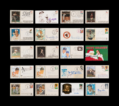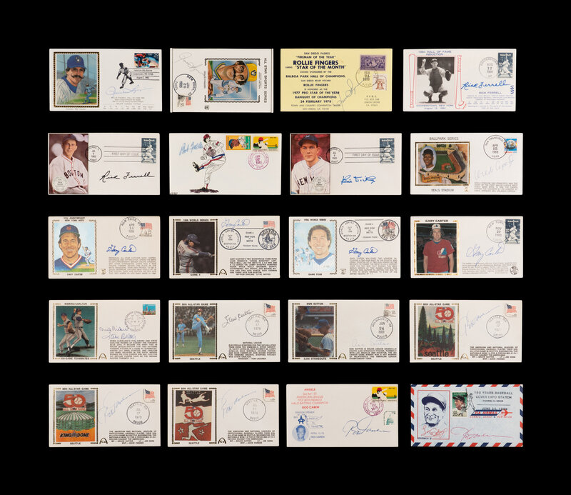 Comprising: Reggie Jackson, Nolan Ryan, Willie Stargell (x2), Gary Carter (x4), Rod Carew (x6), George Brett, Tony Gwynn/Don Mattingly dual signed, Lou Brock, Frank Robinson, Joe Sewell, Enos Slaughter, Ozzie Smith (x2), Duke Snider (x2), Warren Spahn, Don Sutton (x2), Alan Trammell, Earl Weaver, Hoyt Wilhelm, Billy Williams (x2), Luis Aparicio (x2), Jim Bunning, Steve Carlton, Steve Carlton/Phil Niekro dual signed, Orlando Cepeda, Bill Dickey, Bob Feller, Rick Ferrell (x2 including signed letter), Rollie Fingers (x4), Goose Gossage/George Frazier dual signed), Goose Gossage (x2), Billy Herman, Fergie Jenkins/Terry Puhl dual signed, Fergie Jenkins, George Kell (x2), Lee MacPhail, Juan Marichal, Johnny Mize, Lou Fonseca/Joe Morgan dual signed, Hal Newhouser (x2), Phil Niekro (x2), Jim Palmer, Gaylord Perry, Jim Price, Brooks Robinson (x2).