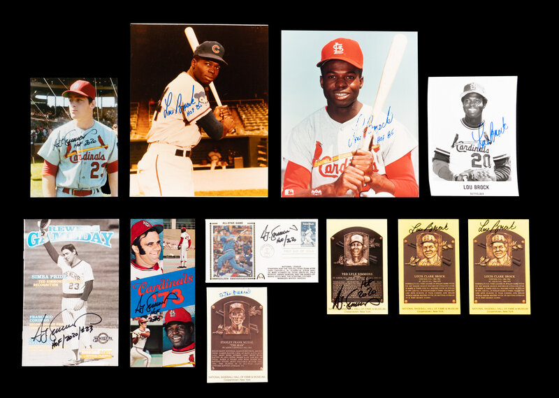 Comprising two Lou Brock Hall of Fame postcards; one Stan Musial signed Hall of Fame postcard; one Ted Simmons signed Hall of Fame postcard; three Lou Brock signed photographs; one Ted Simmons signed 1983 All-Star cachet; one Ted Simmons signed photograph; two Ted Simmons signed team items.