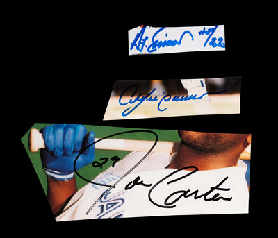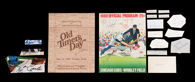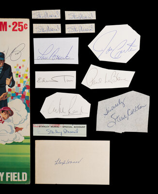 Comprising two Joe Carter cuts; one Lloyd Waner signed index card; one Steve Carlton signed cut; one Andre Dawson signed cut; five Stan Musial signed cuts; one Ted Simmons signed cut; one Lou Brock signed cut; one multi-signed Chicago Cubs vs. Detroit Tigers program featuring Ernie Banks; one 1980 Chicago Cubs vs. Cincinnati Reds multi-signed game program and three addition cut signatures.