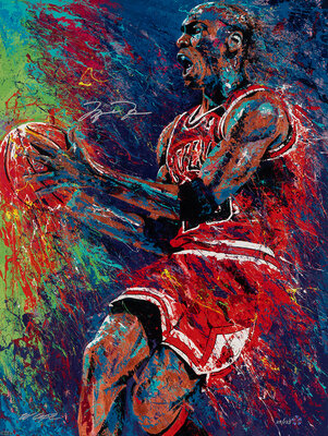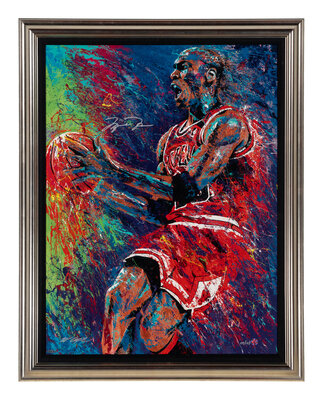 Stunning artwork that captures the essence of Michael Jordan's dynamic moves through the air. This officially licensed Upper Deck Authenticated giclee created by artiest William Lopa feautres a strong and bold Jordan autograph in silver accompanied by Lola's signature.