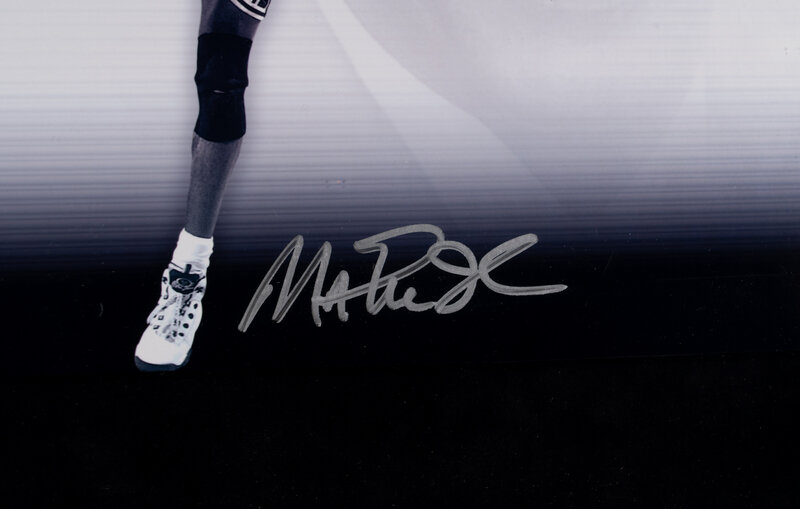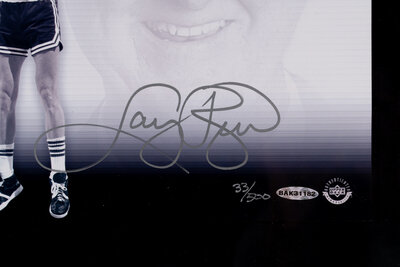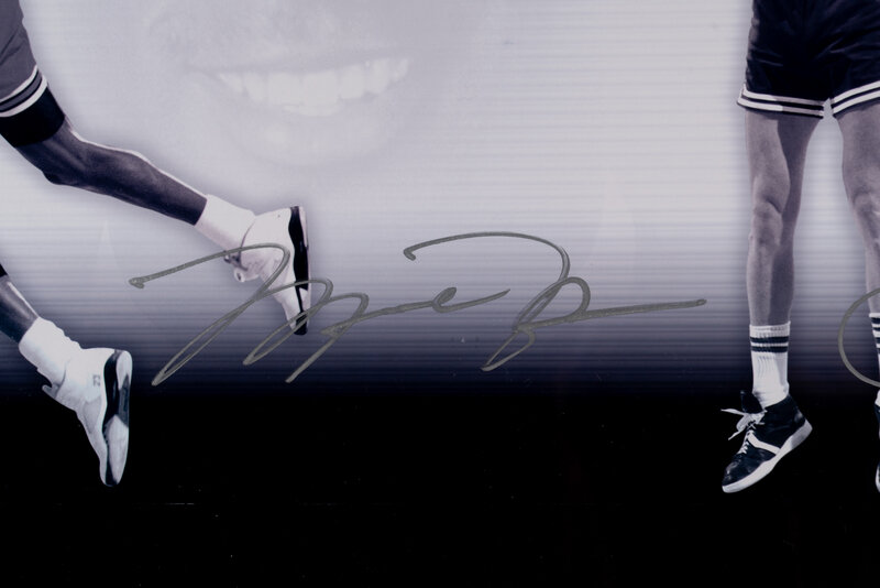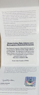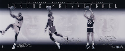 Three of the NBA's most important figures: Magic Johnson, Michael Jordan and Larry Bird are captured in this brilliant, limited edition Upper Deck artwork. This work from the Platinum Edition shares Bird's jersey number 33 in a series of 500. Large, bold signatures of Johnson, Jordan and Bird dominate this fitting tribute to basketball's greatest of the 80s.