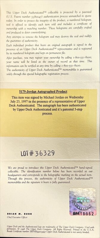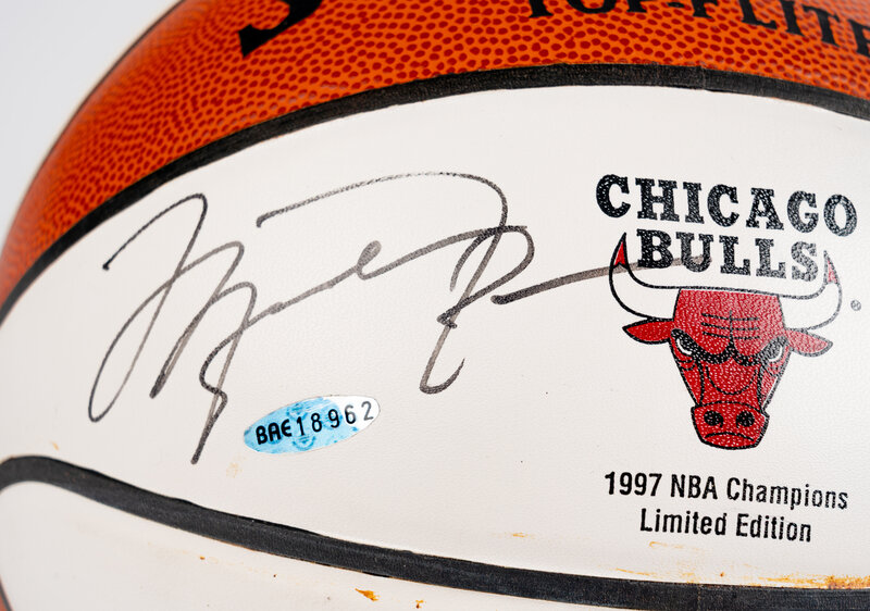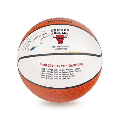 This Spalding commemorative basketball from the Chicago Bulls fifth NBA championship features a large Jordan autograph signed in black Sharpie on white panel next to Bulls logo. An Upper Deck hologram and LOA accompanies Jordan's signature.