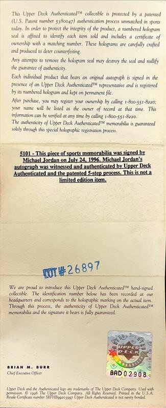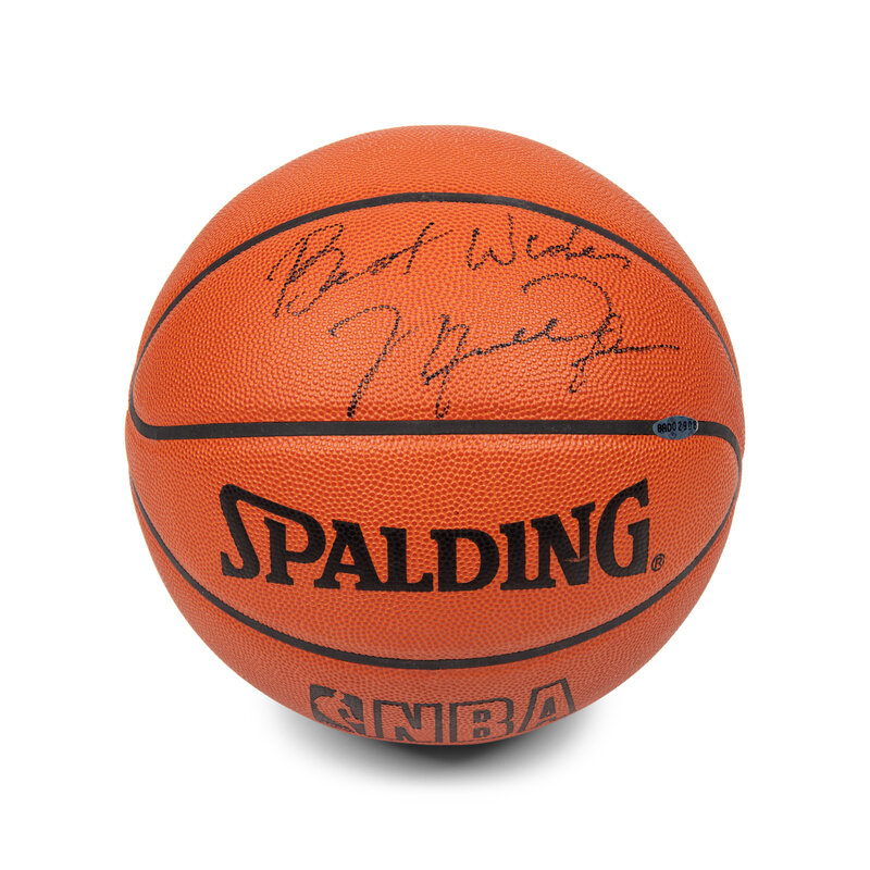 This Spalding NBA basketball features an uncommon "Best Wishes" inscription and Jordan signature across panel. A wonderful Jordan autograph that MJ undoubtedly took time and care applying. An Upper Deck hologram and LOA accompanies Jordan's signature.