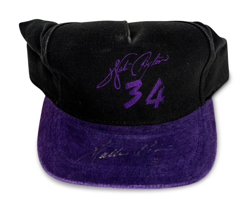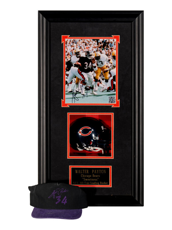 Comprising an uncommon Walter Payton 34 signed hat; signed photo display with unsigned Chicago Bears mini helmet.