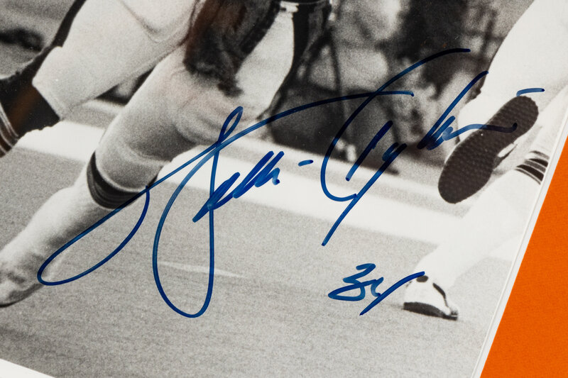 Custom framed and matted 18" x 22" display featuring a signed photo of Walter Payton. Alongside an unsigned photograph of Sweetness with Jim McMahon.