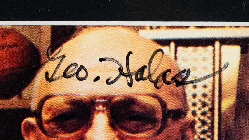 Signed photo Display of George Halas. Also including a rare Type 1 photo of George Halas along with fellow Hall of Famers Dan Fortmann and George Musso from the unforgettable 1940 NFL Championship where the Bears defeated the Redskins 73-0 thanks to the T-Formation. Photo is dated on back 12/12/40 as it originally appeared in a newspaper following the game. With an original Halas original business card and LOA.