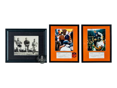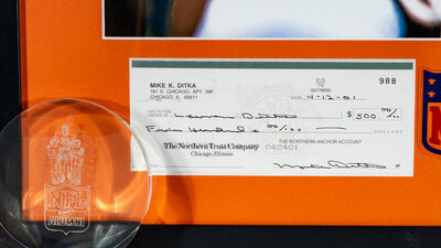 Assorted items from Mike Ditka’s home in Chicago. Including 2 framed and matted checks; an Alumni award; framed original news photograph of Ditka, Joe Marconi & Ronnie Bull dated 7/14/1963 on back.
