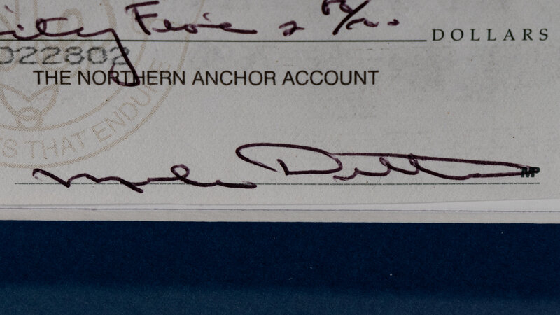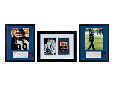 Assorted items from Mike Ditka’s home in Chicago including two framed and matted checks along with an NFL Alumni patch display.