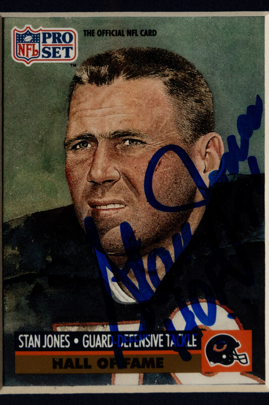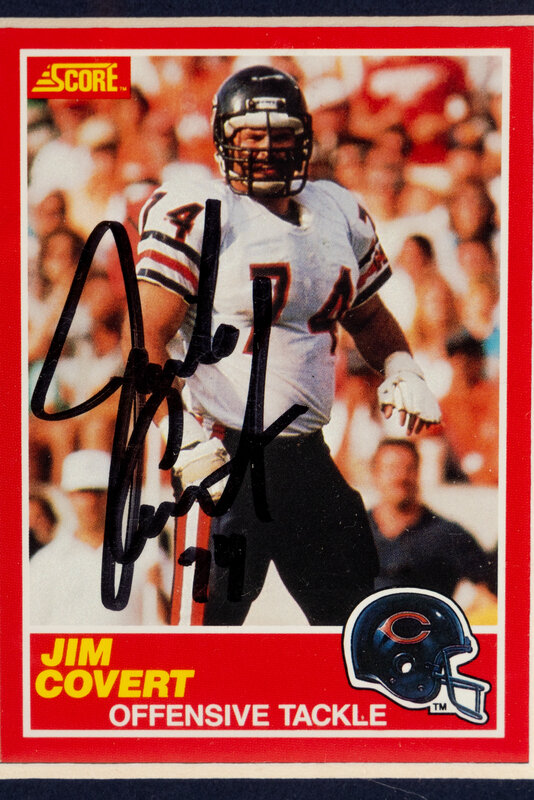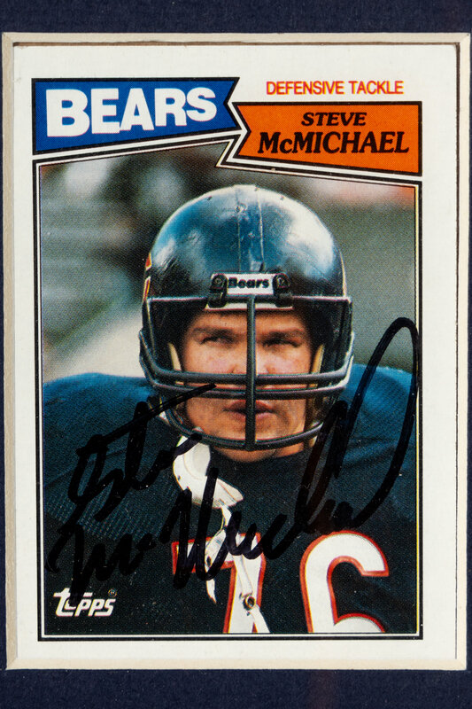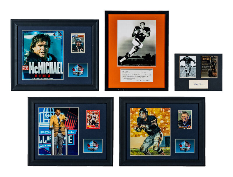 Comprising display featuring trading cards signed by Jimbo Covert (1989 Score), Steve McMichael (1987 Topps) and Stan Jones (1991 Pro Set). Along with signed displays of George Connor and Mike Ditka.
