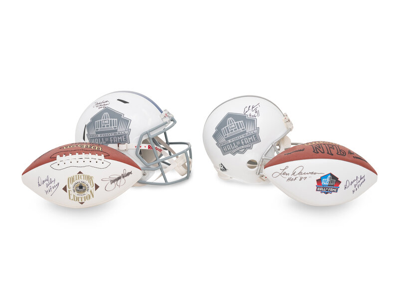 Comprising two full size Hall of Fame helmets signed by Jackie Smith (multiple inscriptions) and Earl Campbell (HOF 91 inscription). With two full size footballs signed by Len Dawson, Dave Wilcox and Jimmy Johnson.