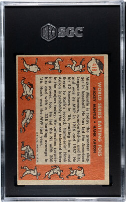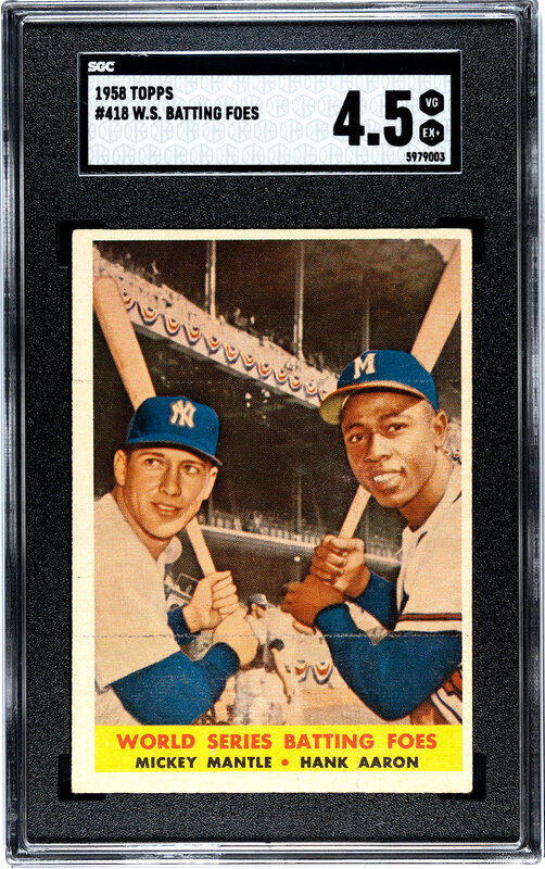 A 1958 Topps Mickey Mantle / Hank Aaron World Series Batting Foes Baseball Card No. 418 (SGC 4.5 VG-EX+)