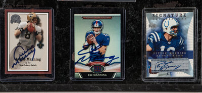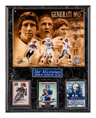 Comprising Archie Manning signed 2000 Fleer Greats of the Game; Peyton Manning signed 2004 Upper Deck Foundations; 2011 Topps Platinum Eli Manning signed.