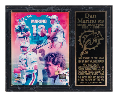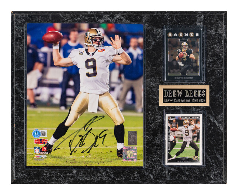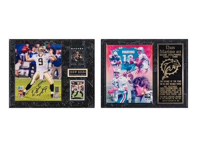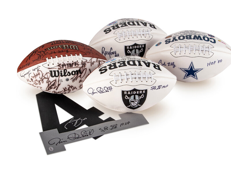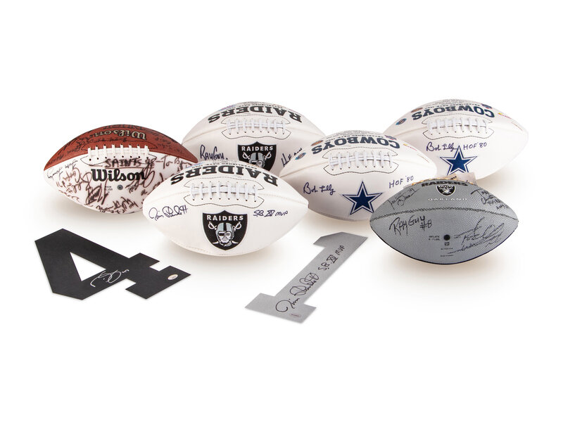 Comprising two Bob Lilly signed footballs; one Jim Plunkett signed football; one Jim Plunkett signed jersey number; one Darren Sproles signed jersey number; one Ray Guy signed football; one multi signed Raiders mini, football featuring Tim Brown, Todd Christensen, Ray Guy, Rod Woodson, Ken Stabler, Marv Hubbard and Cliff Branch; 1995 New Orleans Saints team signed banquet football including Tom Landry (banquet program included), a Drew Brees Signed Display, and a Dan Marino Signed Display