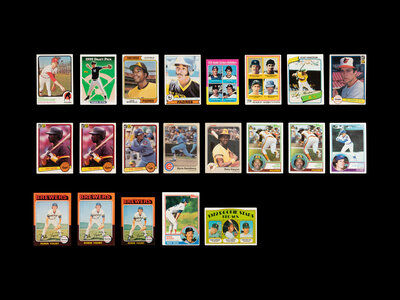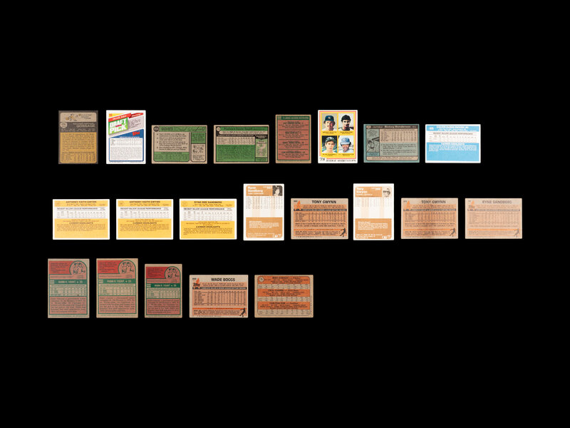 1972 Topps Carlton Fisk; 1973 Topps Goose Gossage; 1974 Topps Dave Winfield; 1979 Topps Ozzie Smith; 1975 Topps Robin Yount (x2); 1975 Topps Mini Robin Yount; 1975 Topps Mini Gary Carter; 1978 Topps Paul Molitor / Alan Trammell; 1980 Topps Rickey Henderson; 1982 Donruss Cal Ripken Jr.; 1983 Donruss Tony Gwynn (x2); 1983 Donruss Ryne Sandberg; 1983 Fleer Ryne Sandberg; 1983 Fleer Tony Gwynn; 1983 Topps Tony Gwynn (x2); 1983 Topps Ryne Sandberg; 1983 Topps Wade Boggs; 1993 Topps Derek Jeter.