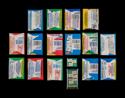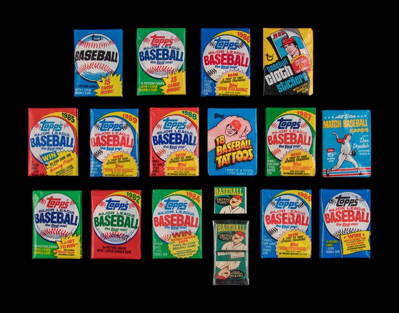 1960 Topps Baseball Tattoos Wax Pack (x2); 1960 O-Pee-Chee Baseball Tattoos Wax Pack; 1966 Fleer All Star Match Baseball Wax Pack; 1977 Topps Cloth Sticker Baseball Wax Pack; 1980 Topps Baseball Wax Pack; 1981 Topps Baseball Wax Pack (x2); 1982 Topps Baseball Wax Pack; 1983 Topps Baseball Wax Pack; 1984 Topps Baseball Wax Pack; 1985 Topps Baseball Wax Pack; 1986 Topps Baseball Tattoos Wax Pack; 1986 Topps Baseball Wax Pack; 1987 Topps Baseball Wax Pack; 1988 Topps Baseball Wax Pack; 1989 Topps Baseball Wax Pack (x2),