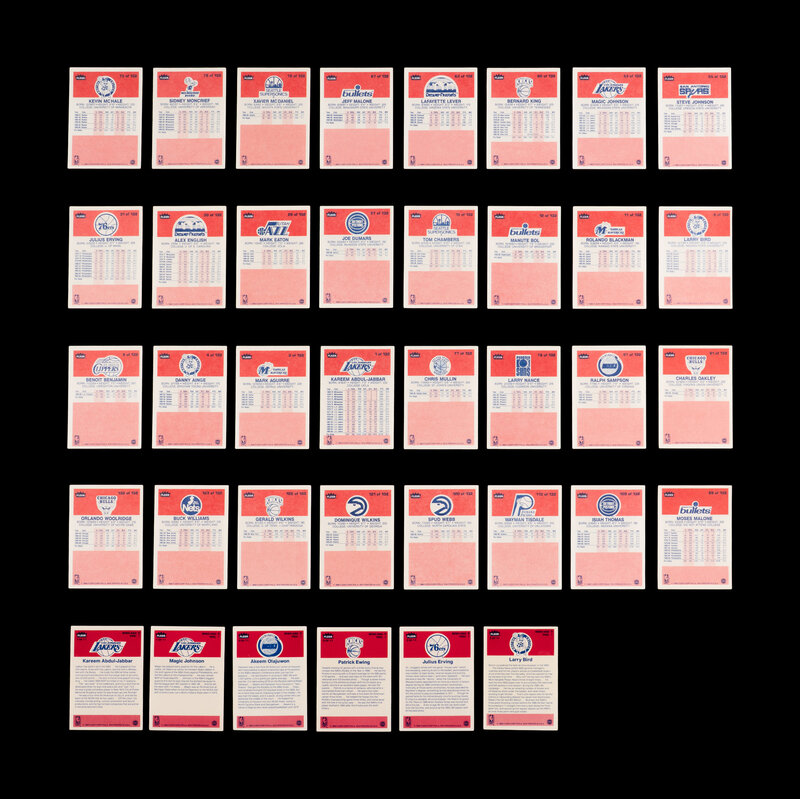 Kareem Abdul-Jabbar (No. 1), Mark Aguirre (No. 3), Danny Ainge (No. 4), Benoit Benjamin (No. 8), Larry Bird (No. 9), Rolando Blackman (No. 11), Manute Bol (No. 12), Tom Chambers (No. 15), Joe Dumars (No. 27), Mark Eaton (No. 28), Alex English (No. 30), Julius Erving (No. 31), Magic Johnson (No. 53), Steve Johnson (No. 55), Bernard King (No. 60), Fat Lever (No. 63), Jeff Malone (No. 67), Moses Malone (No. 69), Xavier McDaniel (No. 72), Kevin McHale (No. 73), Sidney Moncrief (No. 75), Chris Mullin (No. 77), Larry Nance (No. 78), Charles Oakley (No. 81), Ralph Sampson (No. 97), Isiah Thomas (No. 109), Wayman Tisdale (No. 113), Spud Webb (No. 120), Dominique Wilkins (No. 121), Gerald Wilkins (No. 122), Buck Williams (No. 123), Orlando Woolridge (No. 130); Stickers: Kareem Abdul-Jabbar (No. 1), Larry Bird (No. 2), Julius Erving (No. 5), Patrick Ewing (No. 6), Magic Johnson (No. 7), Akeem Olajuwon (No. 9).