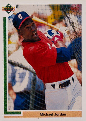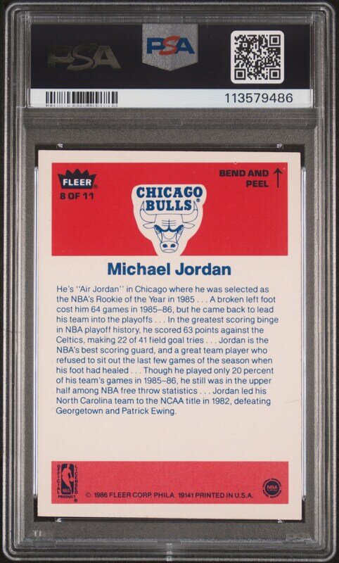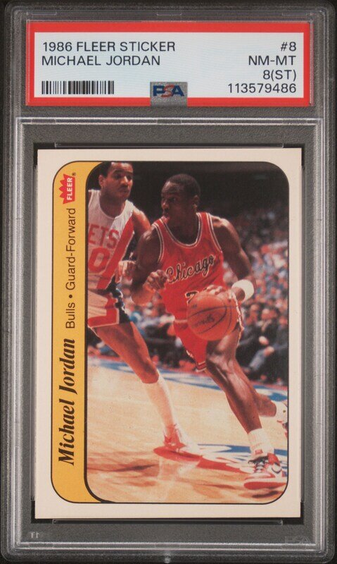 A 1986 Fleer Michael Jordan Rookie Sticker No. 8 (PSA 8 NM ST) and 1991 Upper Deck Baseball Card No. SP1