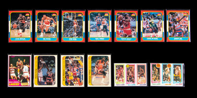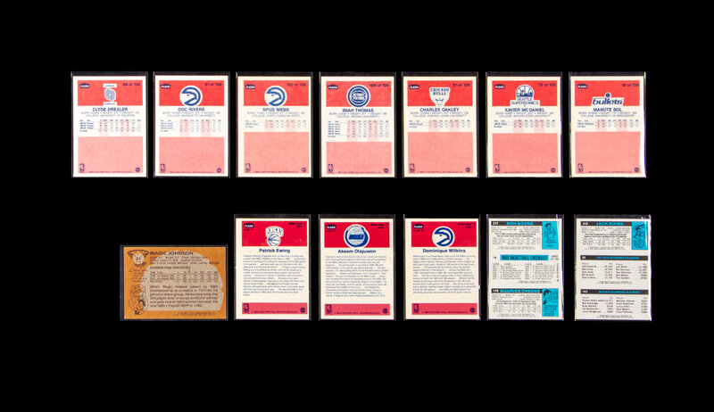 1980 Topps Larry Bird Scoring Leader No. 30; 1980 Topps Magic Johnson All Star No. 18; 1981 Topps Magic Johnson No. 21; 1986 Fleer Manute Bol No. 12; 1986 Fleer Clyde Drexler No. 26; 1986 Fleer Xavier McDaniel No. 72; 1986 Charles Oakley No. 81; 1986 Fleer Doc Rivers 91; 1986 Fleer Isiah Thomas No. 109; 1986 Fleer Spud Webb No. 120; 1986 Fleer Sticker Patrick Ewing No. 6; 1986 Fleer Sticker Akeem Olajuwon No. 9; 1986 Fleer Sticker Dominique Wilkins No. 11.