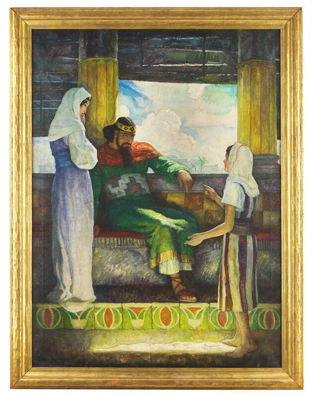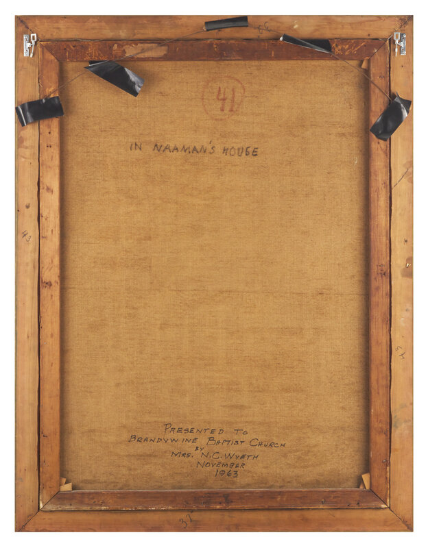 signed N. C. WYETH (underlined, lower left); also inscribed 41 (circled) / IN NAAMAN'S HOUSE / Presented to Brandywine Baptist Church by Mrs. N. C. Wyeth November 1963 (on the reverse) and 7 in. 4 colors/120 (illegible) in pencil (stretcher)