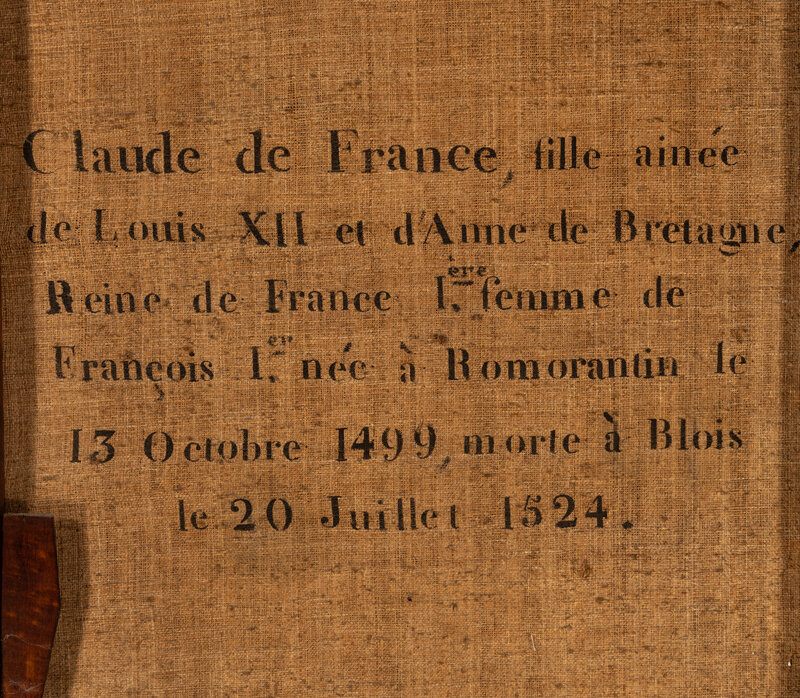 bears inscription Claude de France, fille aînée /de Louis XII et d'Anne de Bretagne, /Reine de France, 1ère épouse de /François Ier, née à Romorantin le /13 octobre 1499, morte à Blois /le 20 juillet 1524; bears the insignia of Louis Philippe II, Duke of Orléans (on the reverse)