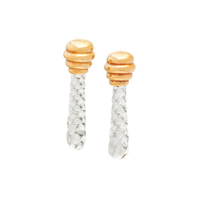 Set with two glass spiral drops. Mounted in 18 karat yellow gold. 2 3/8 inches long.