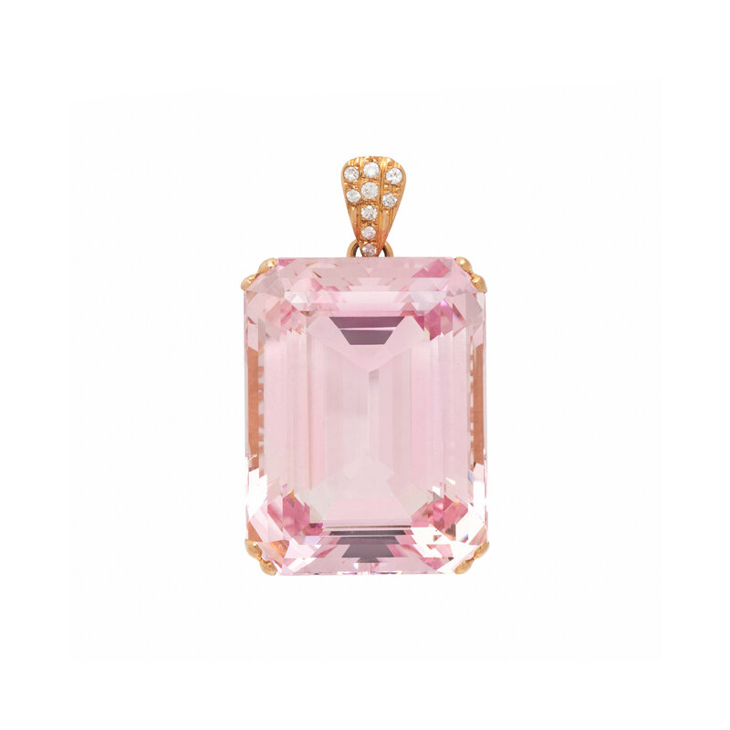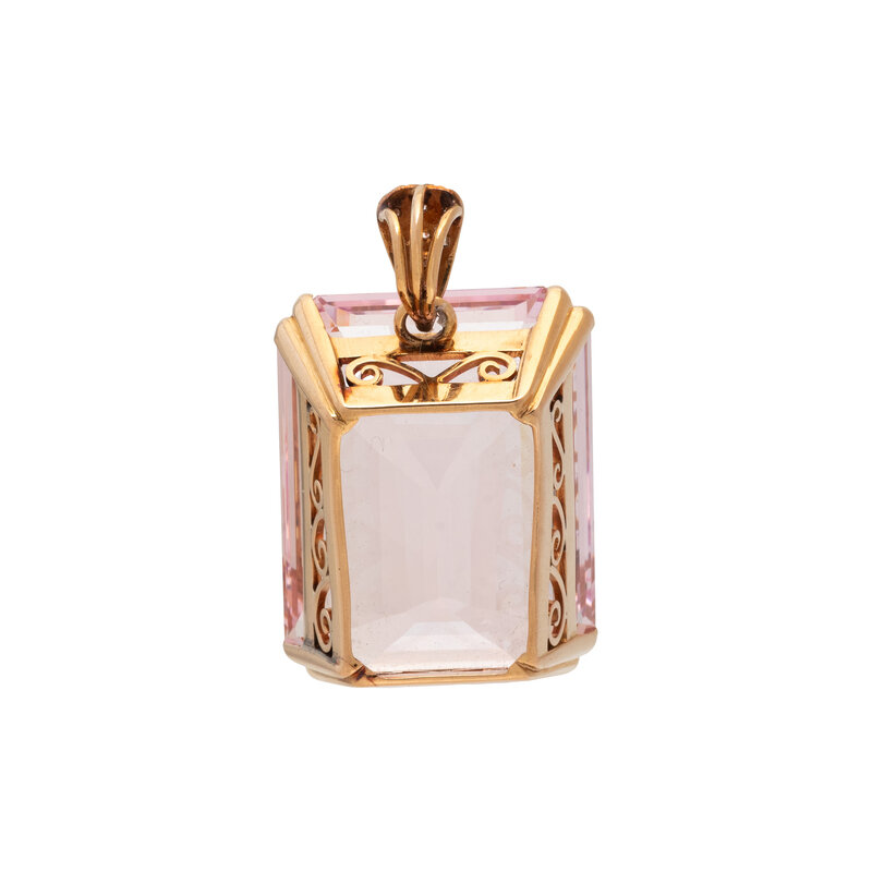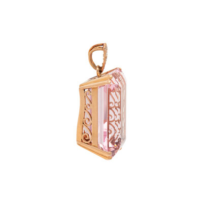Featuring an emerald cut Morganite beryl weighing approximately 90.00 - 95.00 carats total, with round diamond accents on the bail. Mounted in rose gold. 1 3/4 inches long.