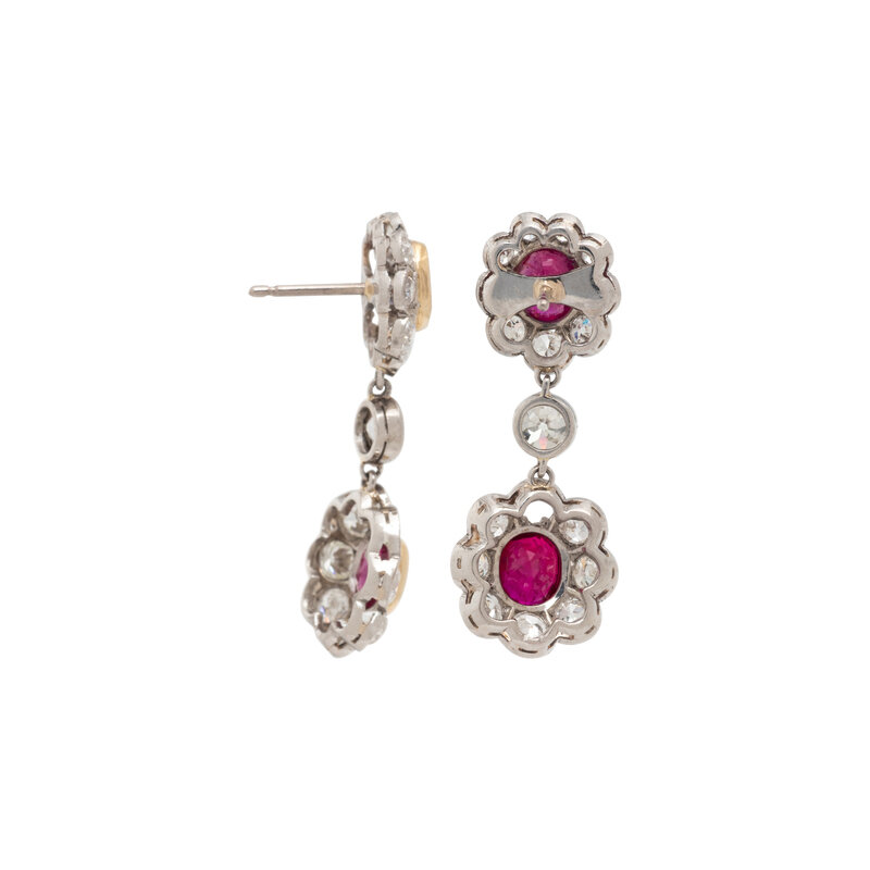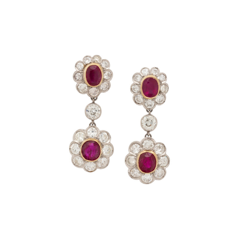 Collet set oval rubies framed by round diamonds, suspending a similar element, the diamonds weighing approximately 3.50 - 4.00 carats total. Platinum and yellow gold. 1 1/4 inches long.