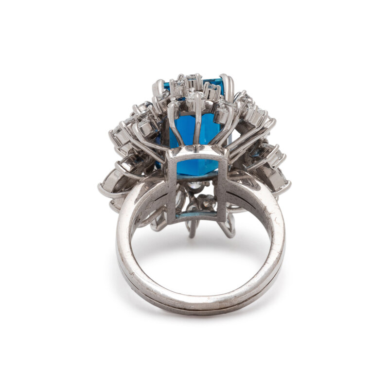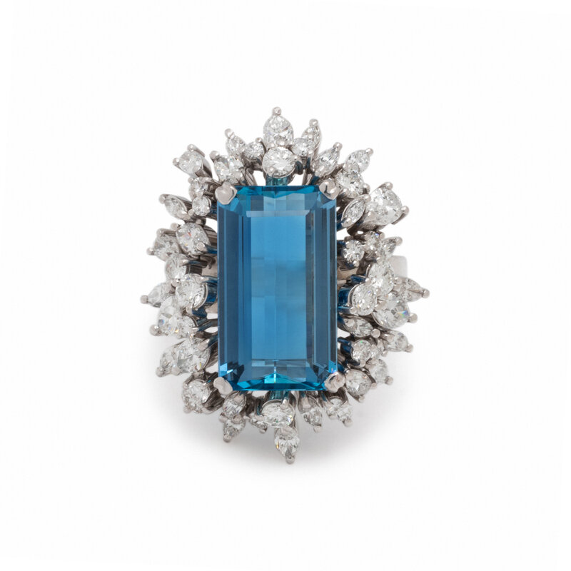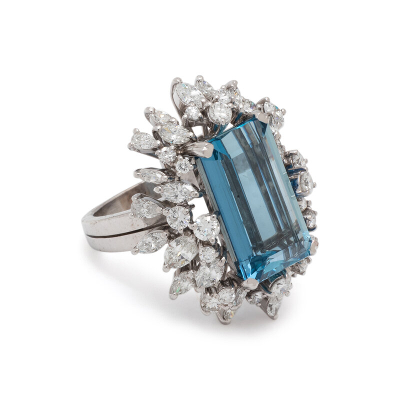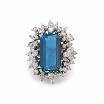 Set with an emerald cut aquamarine weighing approximately 7.00 carats by formula, and round, pear, and marquise cut diamonds weighing approximately 2.50 - 3.00 carats total. Mounted in 18 karat white gold. Ring size 6 3/4.