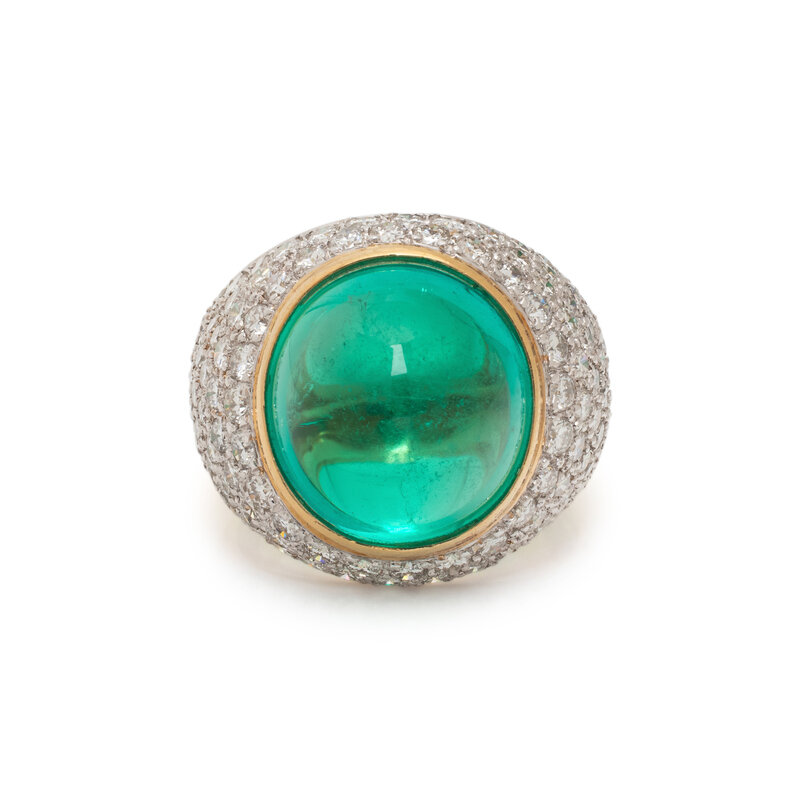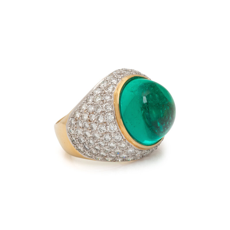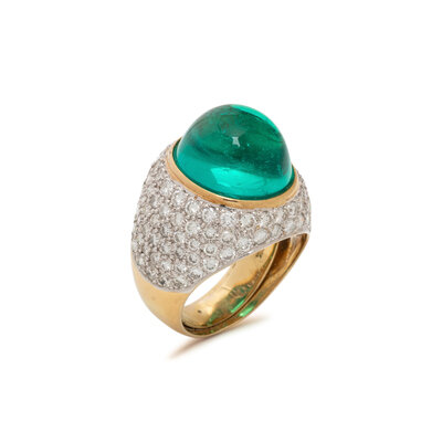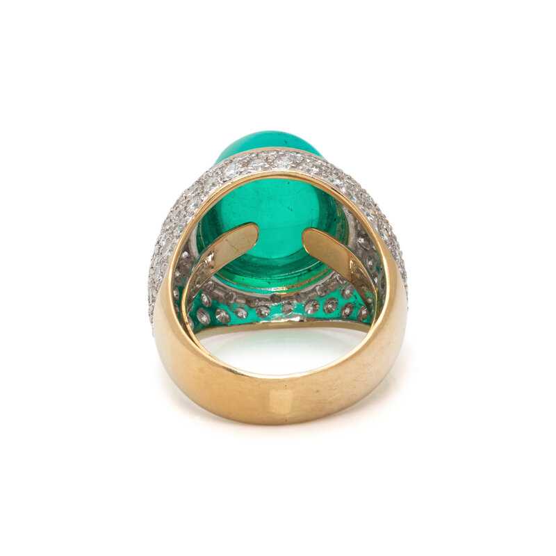 Centered by an oval cabochon emerald, weighing approximately 15.00-16.00 carats by formula, in a pave-set round brilliant cut diamond mounting, weighing approximately 3.00 - 4.00 carats total. Mounted in 18 karat yellow and white gold. Ring size 7.