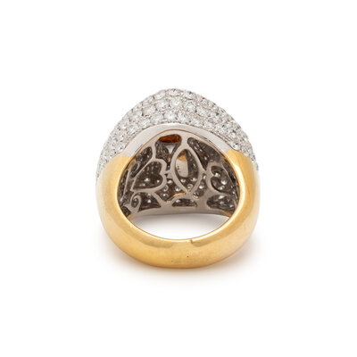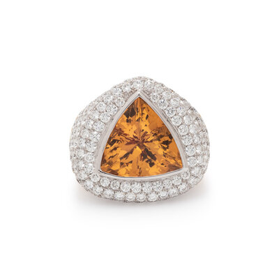 Set with a triangle cut topaz measuring approximately 14.00 x 14.50 mm, with pavé diamond surround, weighing approximately 5.00 - 6.00 carats total. Mounted in 18 karat white and yellow gold. Ring size 7.