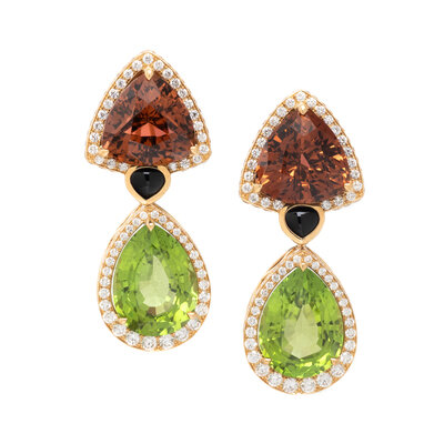 Designed with triangular brown tourmaline tops, weighing approximately 11.30 carats total, suspending pear shaped peridot, weighing approximately 11.83 carats total, with round brilliant cut diamond surround, weighing approximately 1.78 carats total, and accented by black onyx cabochons. Mounted in 18 karat yellow gold. 1 1/2 inches long.