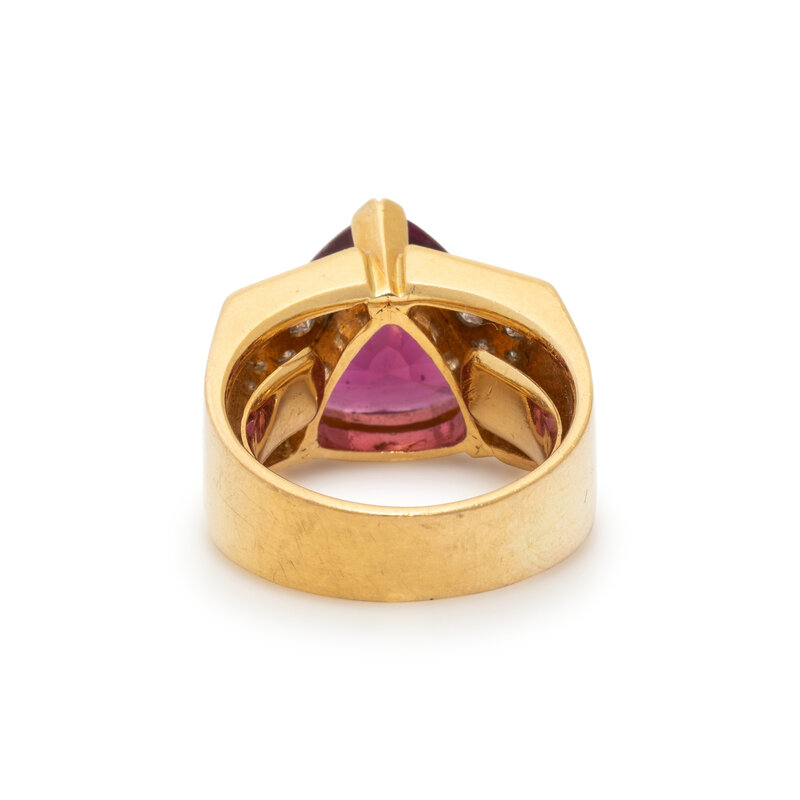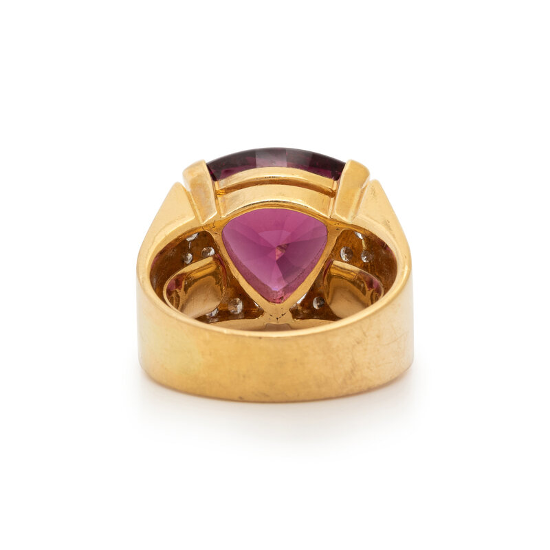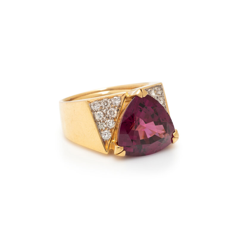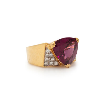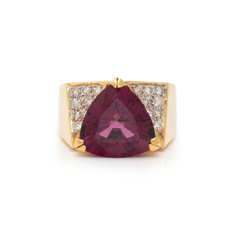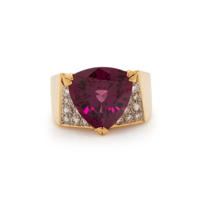 Featuring a triangular garnet weighing approximately 8.95 carats by formula, accented by pavé-set round brilliant cut diamonds weighing approximately 0.40 carat total. Mounted in 18 karat yellow gold. Ring size 8.