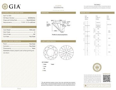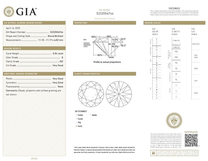 GIA, 2025, Report No. 5232556744, 5.04 carats, E color, SI2 clarity, No fluorescence