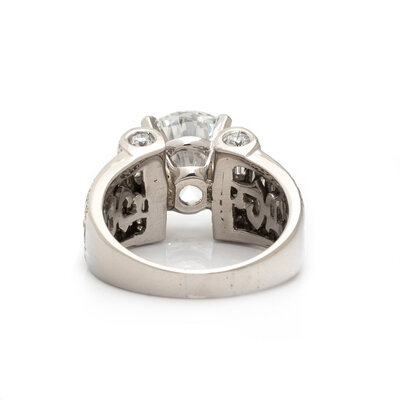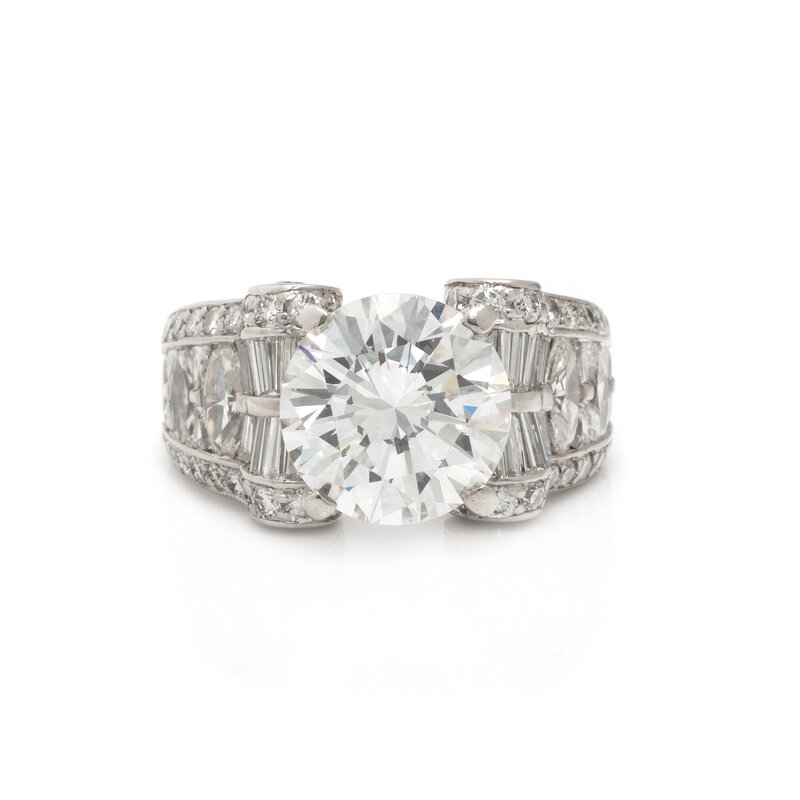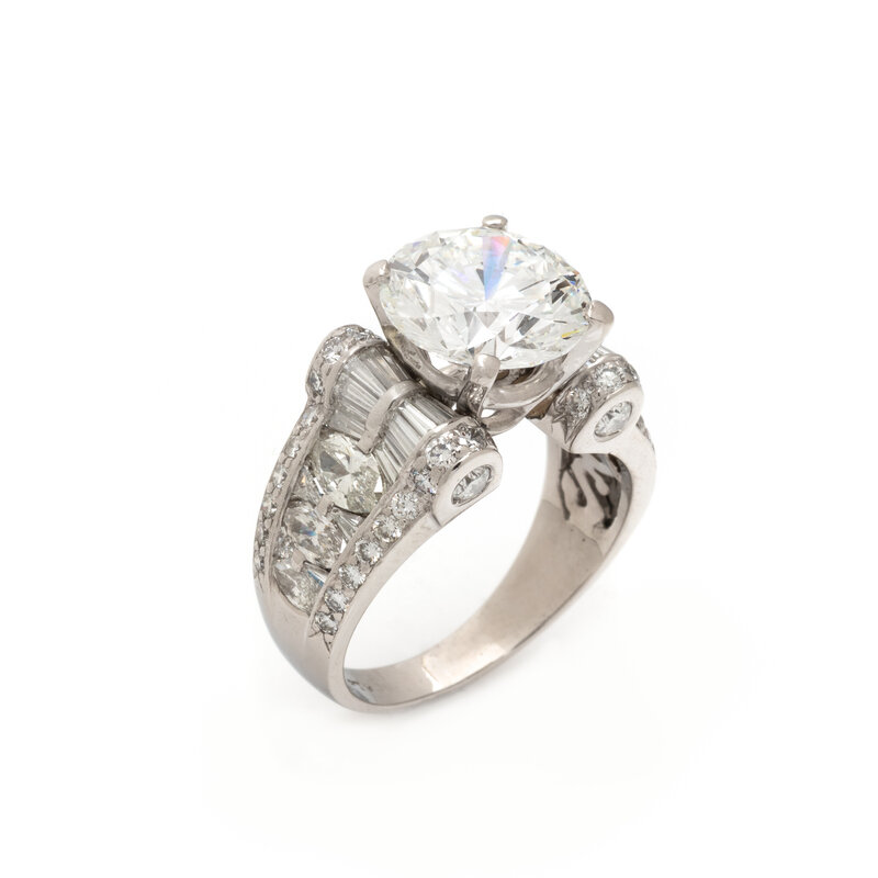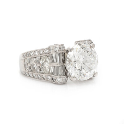 Centered by a round brilliant cut diamond weighing 5.04 carats, scroll motif mounting set with marquise, round, and tapered baguette cut diamonds, weighing approximately 2.60 carats total. Mounted in platinum. Ring size 8 1/4.