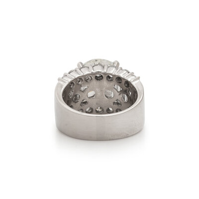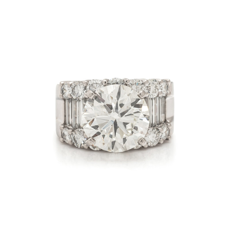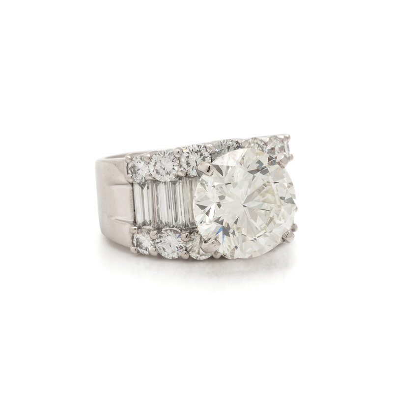 Centering a round brilliant cut diamond weighing 5.91 carats, surrounded by round and baguette cut diamonds weighing approximately 2.95 carats total. Mounted in platinum. Ring size 6.